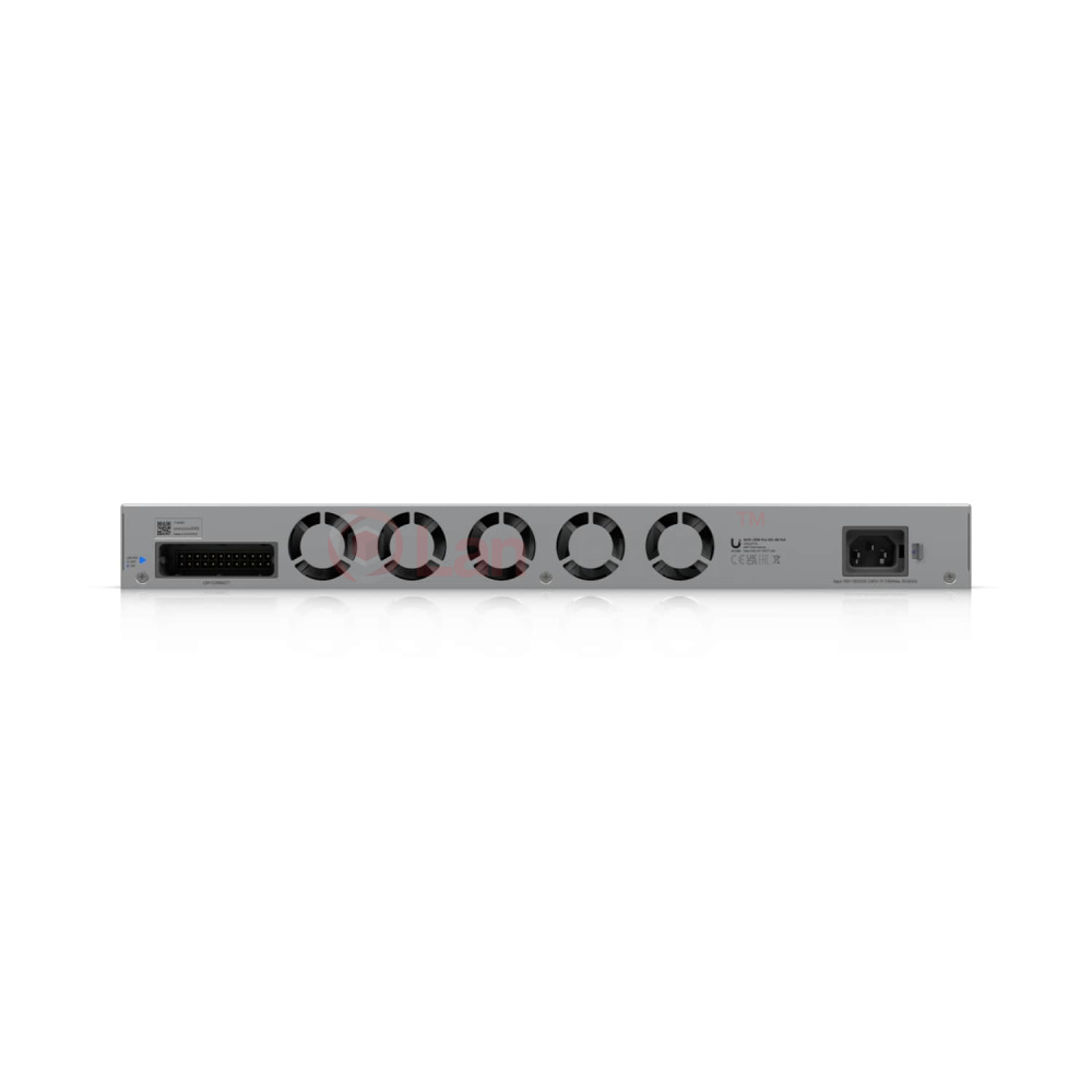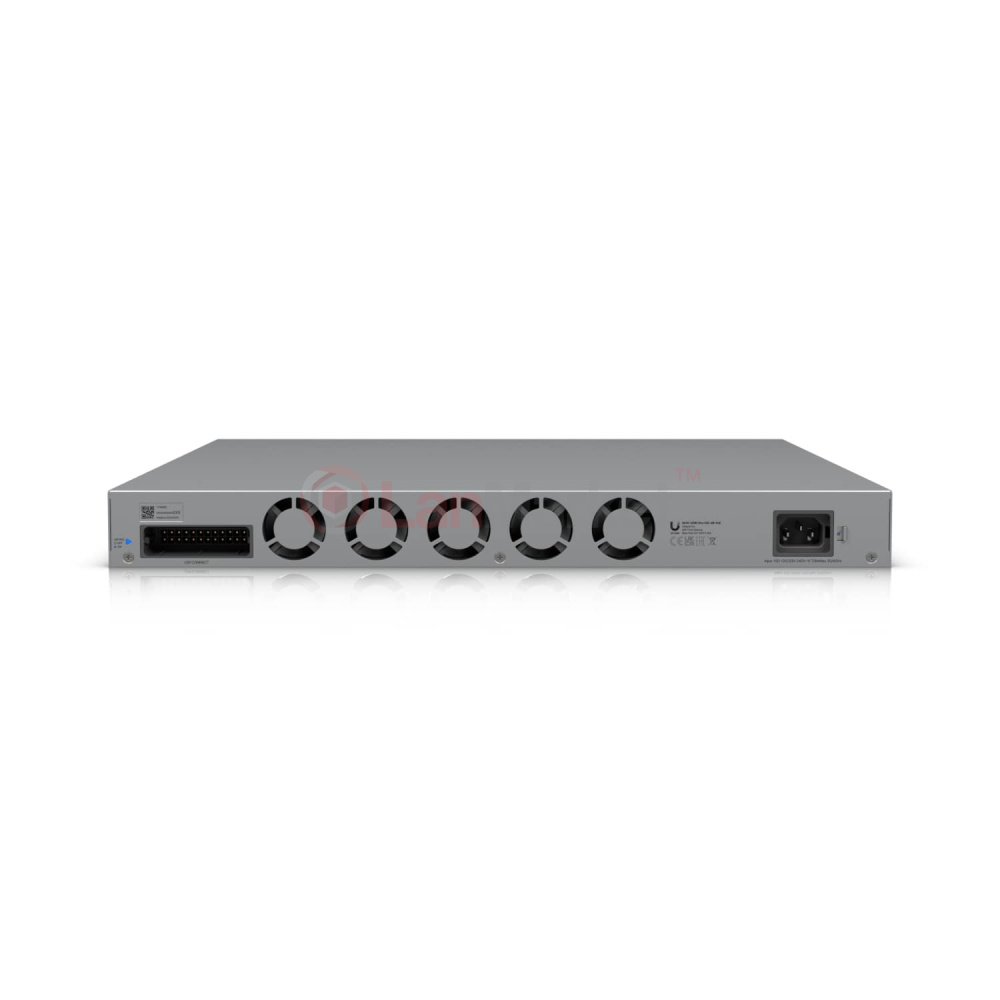 Максимальна потужність PoE залежить від напруги живлення: при 200–240 В — до 1080 Вт, при 100–120 В — до 972 Вт. Для живлення комутатор підтримує основне підключення змінного струму та резервне живлення через USP RPS. Повна сумісність із UniFi Network реалізована починаючи з версії 9.1.120.