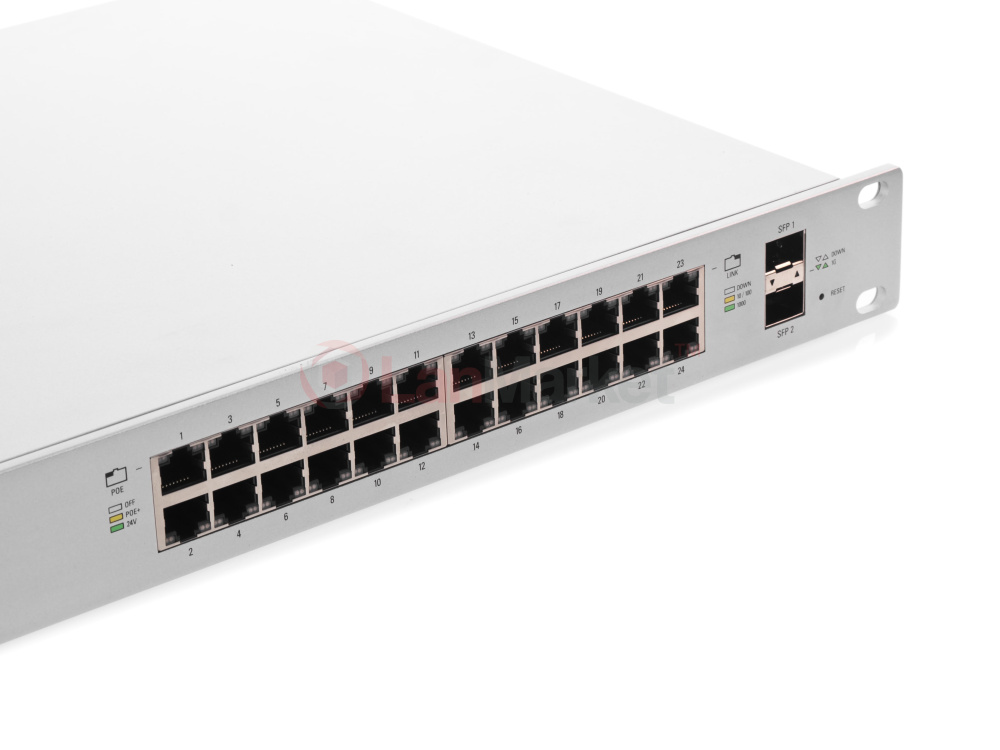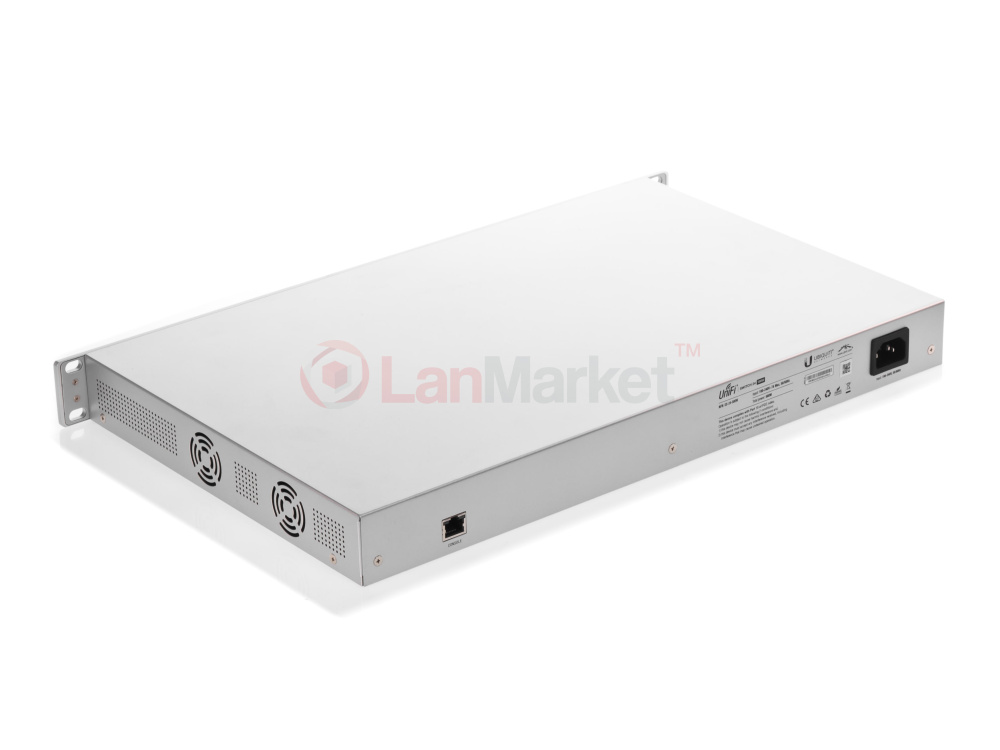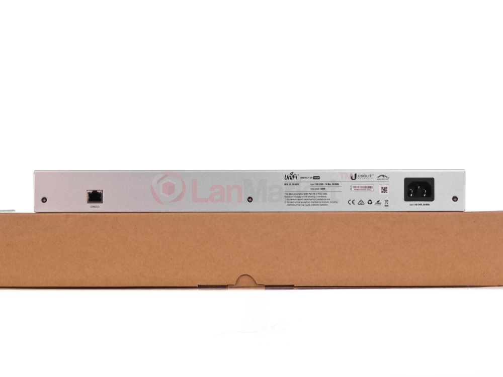 UniFi Switch US-24-250W имеет 24х 10/100/1000Mbps RJ45 Gigabit Ethernet порта, два 1 Gbps SFP порта для подключения к оптоволоконным сетям и дополнительный RJ-45 последовательный порт управления (Console).